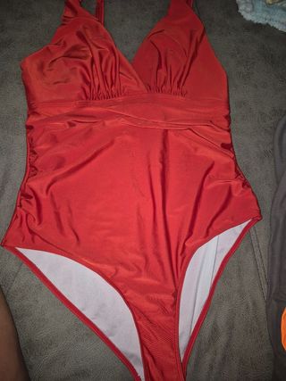 Preciosa pieza de baño de Shein, talla XL (42/14), color rojo. Es un bañador de una sola pieza, con un diseño favorecedor y un corte elegante. - Diseño cruzado en la cintura. - Escote en pico. - Tejido brillante.