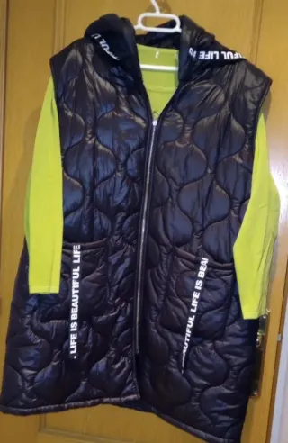 Conjunto de chaleco negro acolchado y suéter de manga larga en color verde b - Chaleco largo sin mangas con cremallera frontal. - Diseño acolchado con estampado. - Suéter de cuello redondo y manga larga.