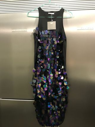 Mono de niña terciopelo negro con hilo brillante. Manga larga y tirante en la otra. Marca Zara, 8-9 años