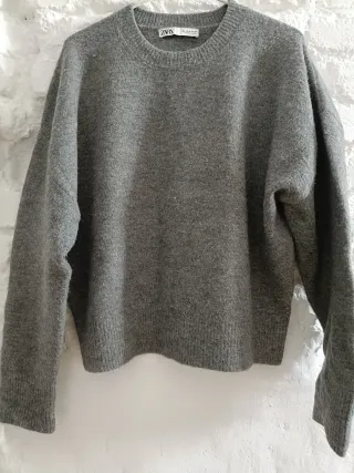 Jersey de punto oversize de Zara en color gris. Su corte holgado lo hace muy cómodo y versátil. - Tejido suave al tacto. - Cuello redondo. - Manga larga. Está en muy buen estado. Puede tener alguna bolita del punto, pero se enviará cepillado.
