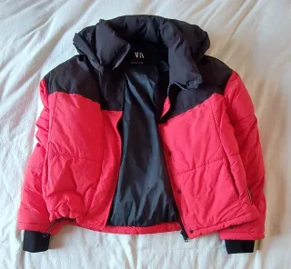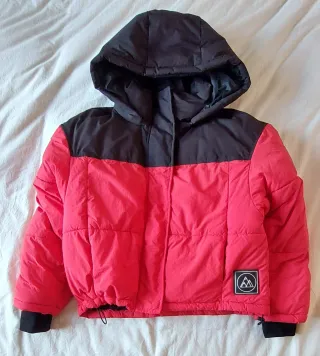 Plumas tipo bomber de Zara con un diseño moderno y llamativo. Con capucha. Ajustable a la cintura - Diseño bicolor en rojo y negro. - Cuello alto y acolchado. - Cierre de cremallera. - Puños elásticos.