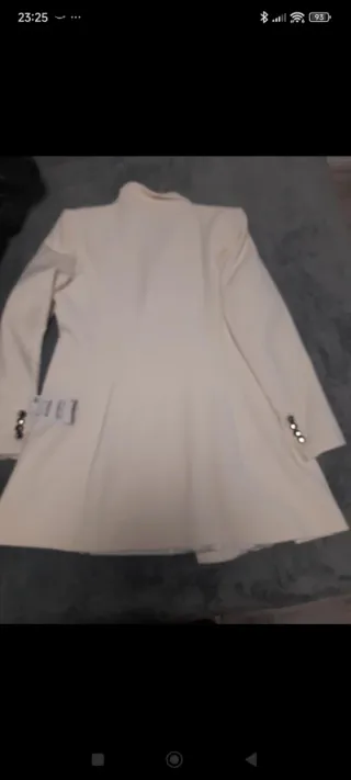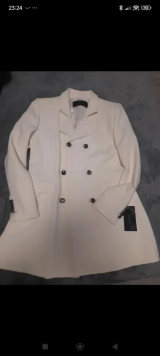 Abrigo ligero de la marca Zara, talla XL. Es una prenda elegante y versátil.Precioso abrigo Ligero en color crema, con bonitos detalles en mangas de botonería original.No pesa nada y tiene un forro de mucha calidad. Lo doy con su bolsa para guardarlo. Es una talla XL pero viene algo pequeño. Queda muy elegante. - Cierre de doble botonadura. - Bolsillos frontales. - Detalle de botones en los puños.