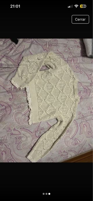 Jersey corto de punto con un diseño de rombos y detalles de encaje en los bordes. Es una prenda versátil y cómoda. - Tejido de punto con textura. - Diseño de rombos calados. - Acabado con puntilla de encaje.