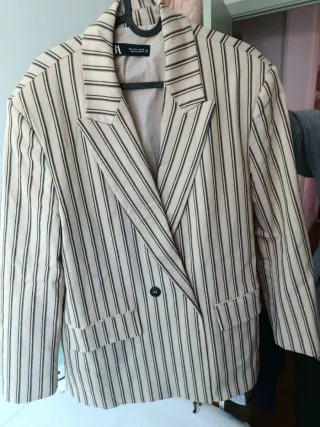Americana de Zara con un diseño de rayas verticales. - Diseño cruzado con dos botones. - Bolsillos delanteros con solapa. - Forro interior. - Cuello solapa clásico.