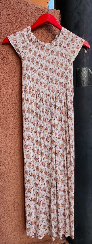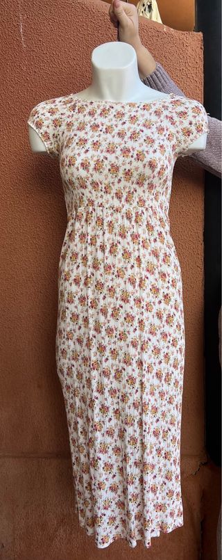Vestido de corte ceñido con estampado floral sobre fondo blanco. El diseño presenta un escote barco y mangas cortas. - Estampado de flores pequeñas en tonos rosas y amarillos. - Tejido elástico y acanalado. - Largo midi. -Talla 13/14 , pero al ser elástico equivale como a una S.
