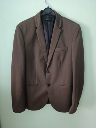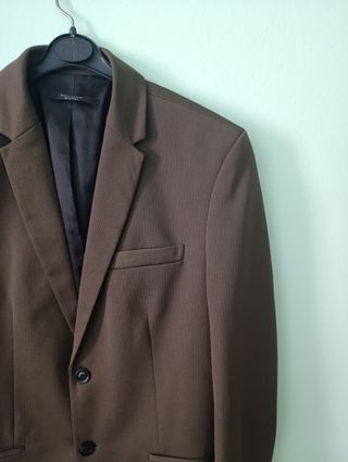Americana de vestir en color marrón de Zara. - Talla M. - Diseño de solapa de muesca. - Cierre de dos botones. - Bolsillos de solapa en la parte delantera. - Puesta solo una vez. - Medidas aproximadas: Ancho: 46-47 cm Largo: 70-71 cm Largo mangas: 60-61 cm