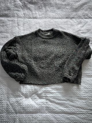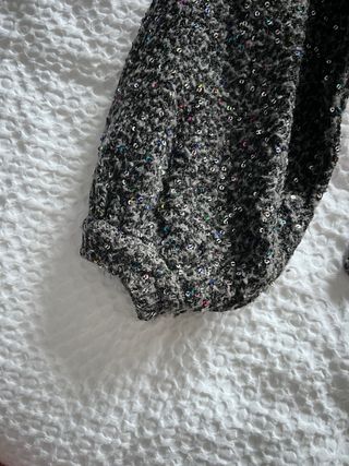 Jersey de punto con un toque brillante de lentejuelas. Mangas algo abullonadas en el puño. Ligeramente crop. Un poquito de bola (foto)