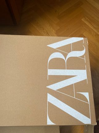 Caja de cartón con el logo de Zara, ideal para guardar ropa de invierno. - Diseño con el nombre de la marca en blanco. - Material de cartón resistente.