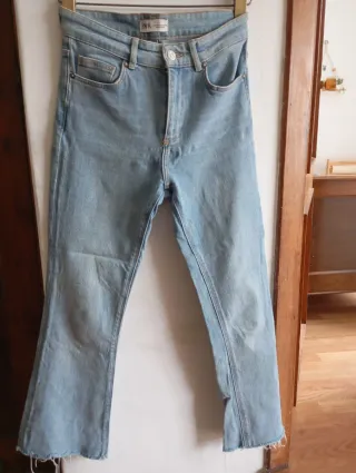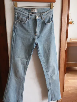 Pantalón vaquero de Zara con corte flare y bajo desflecado. - Estilo moderno y favorecedor. - Diseño de cinco bolsillos. - Cierre de cremallera y botón.