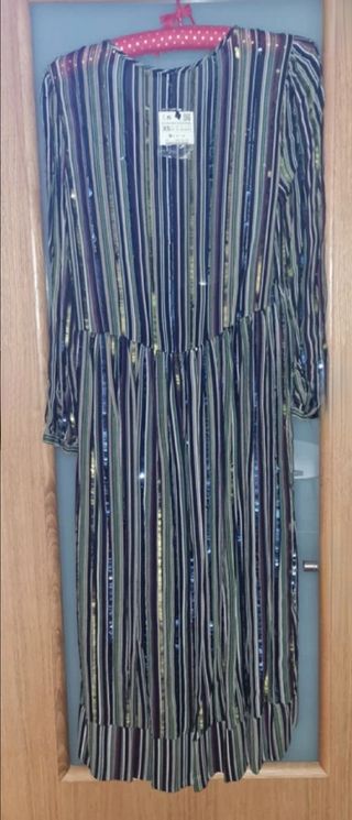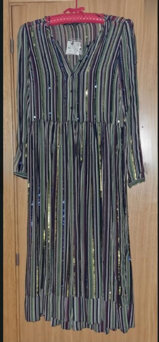 Vestido midi de Zara con un diseño de rayas verticales y detalles de lentejuelas brillantes. El corte es favorecedor y la tela ligera. - Diseño de rayas multicolor. - Abertura en V con botones. - Manga larga. - Cintura elástica. - Bajo con volantes.