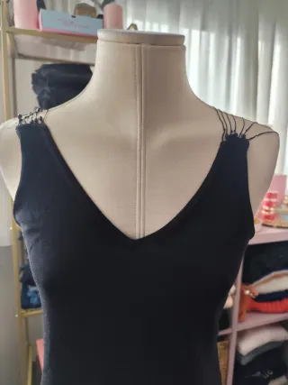 Camiseta de tirantes con escote en V de Zara. Es elástica. - Diseño con tirantes finos y detalle en los hombros. - Tejido suave y cómodo.