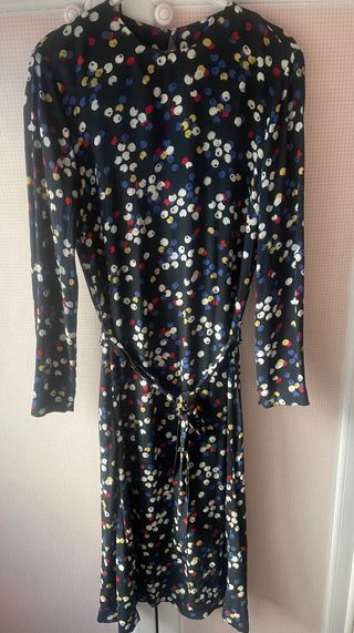 Este vestido largo satinado de Zara cuenta con un estampado de manchas rosas sobre fondo negro, cuello redondo y mangas abullonadas y bolsillos laterales . T .xs