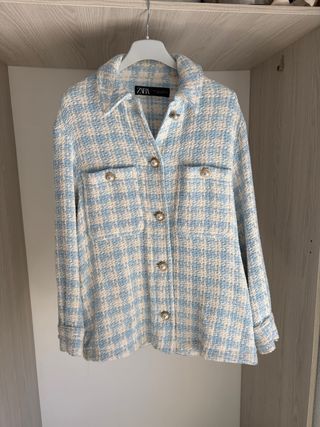 - Diseño de cuadros estilo pata de gallo, tonos azul y crudo. - Cierre de botones. - Dos bolsillos en la parte delantera.