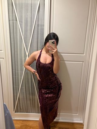 Vestido largo con lentejuelas brillantes. Un diseño elegante y llamativo. - Escote halter. - Corte ajustado al cuerpo. - Largo hasta los tobillos.