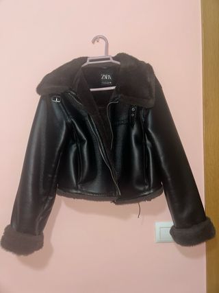 Chaqueta estilo aviador de Zara con un acabado que imita la piel y detalles de borreguito. - Diseño corto. - Cuello con solapas. - Cierre de cremallera. - Puños y bajo con pelo sintético. PRECIO ORIGINAL 65