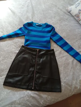 Falda recta de Zara con un diseño de rayas verticales en color beige. Es una prenda versátil. - Diseño de rayas verticales. - Corte recto. - Abertura en la parte delantera. - Le falta un botón interior pero tiene otro cierre