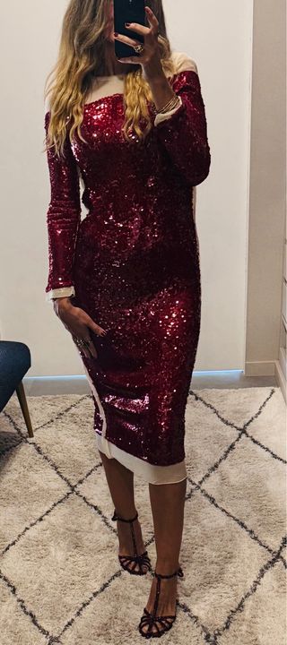 Espectacular vestido corte midi de Zara Limited Edition, en gasa color hueso y lentejuelas color vino, escote caja, manga larga, talla XXS, válido para una talla XS también o S ya que es un corte recto en cintura, cremallera trasera invisible. Impresionante ⭐️♥️♥️⭐️
