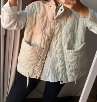 Chaleco acolchado con un diseño moderno y versátil. Color crema. Es como el de Zara. - Acolchado con patrón de rombos. - Cierre de automáticos y cremallera. - Dos bolsillos delanteros. - Cordones ajustables en el bajo.
