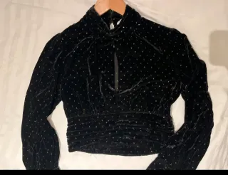 Elegante top de terciopelo con detalles brillantes. - Tejido: Terciopelo. - Diseño: Estampado de brillos dorados. - Corte: Ajustado a la cintura. - Cuello: Alto con abertura.