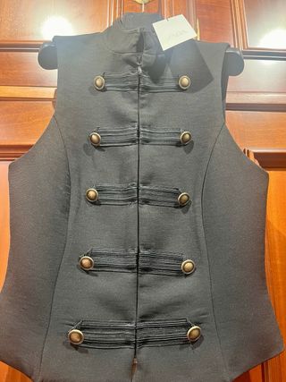Elegante chaleco de la marca Zara con detalles de alamares. - Diseño tipo militar. - Cierre frontal. - Cuello alto.