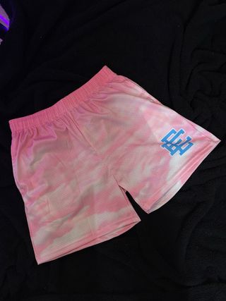 Shorts de malla con un diseño tie-dye en tonos rosados y blancos. Cuentan con un logo azul en la pierna. - Cintura elástica. - Tejido de malla transpirable.