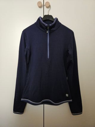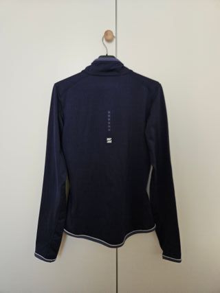Camiseta térmica de manga larga para mujer, talla S-M (mi talla habitual es M). Precio original: 85 €. - Capa base con media cremallera y cuello alto. - Detalle de ribete en el bajo. - Puños con detalles.