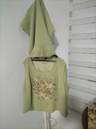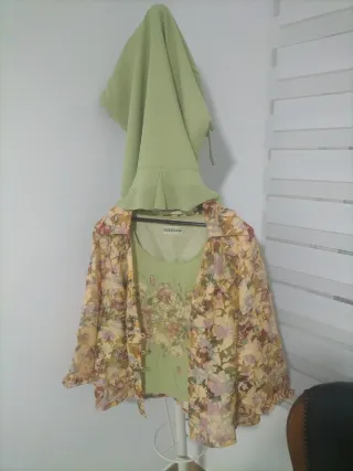 Conjunto de vestir compuesto por un top y una chaqueta. - Top de color verde con detalles florales. - Chaqueta ligera con estampado floral multicolor.