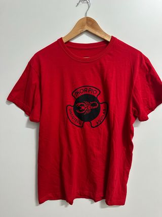 Camiseta de la discoteca Skorpio Águilas. - Diseño con escorpión y texto. - Color rojo vibrante.