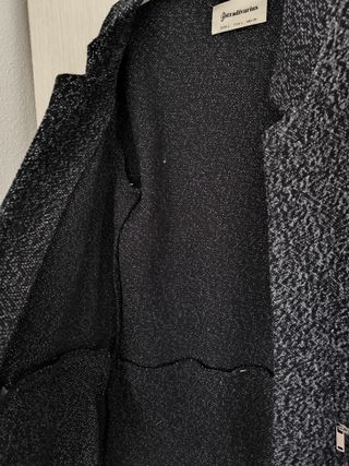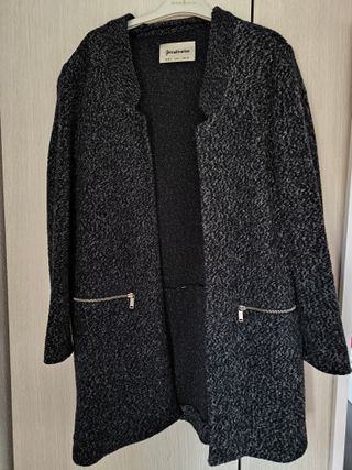 Abrigo de punto con un diseño moderno y versátil. Descosida una parte del bajo. Adjunto foto - Tejido texturizado en tonos negros y grises. - Cierre abierto. - Dos bolsillos frontales con cremallera.