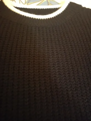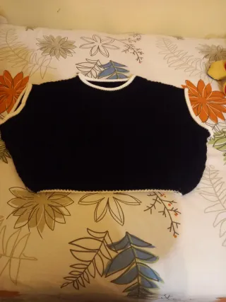 Chaleco corto de punto con un diseño moderno y versátil. - Color principal negro. - Ribete de contraste en blanco en cuello y mangas. - Tejido suave y cómodo.