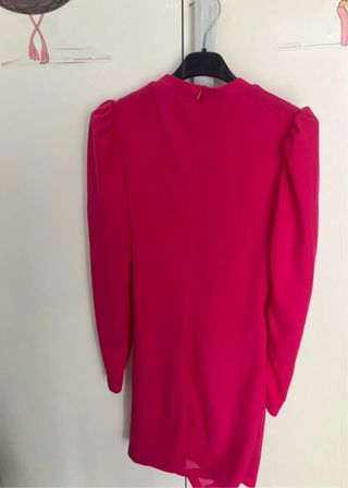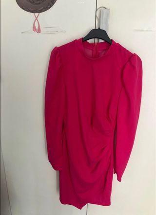 Vestido elegante de color fucsia con un diseño moderno. - Manga larga abullonada. - Detalle de drapeado lateral. - Cremallera oculta en la espalda.