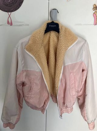 - Un lado es de tejido tipo borreguito en color beige. - El otro lado es de nylon en color rosa y beige.