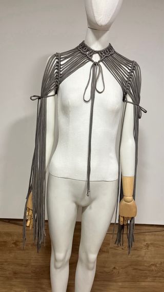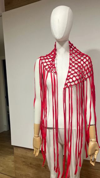 Hombreras de viscosa con un diseño fluido y moderno. Son un accesorio versátil que añade un toque especial a cualquier atuendo. - Diseño con múltiples tiras colgantes. - Acabado en macramé en la zona del cuello y hombros.