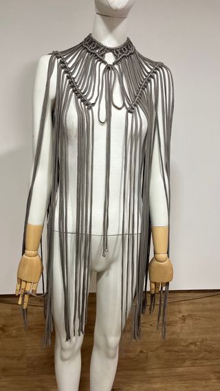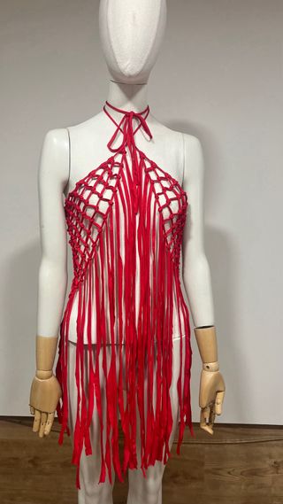 Prenda de punto con flecos largos y diseño abierto. - Diseño de red en la parte superior. - Flecos largos que caen por la parte delantera y trasera. - Se puede llevar de varias maneras.