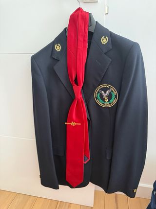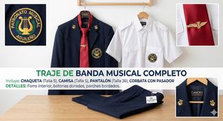 Conjunto completo de uniforme para banda musical. - Chaqueta azul con detalles bordados. - Camisa blanca. - Pantalón azul. - Corbata roja con pasador. - Botones dorados.