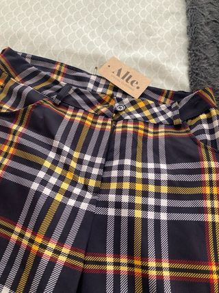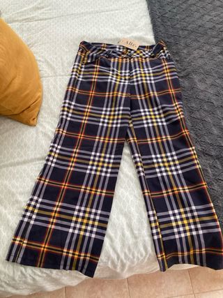 Pantalones de corte ancho con estampado de cuadros. - Diseño de cuadros en tonos azul marino, blanco, amarillo y rojo. - Cintura alta. - Pierna ancha.
