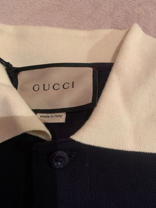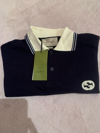 Polo de manga corta de la marca Gucci. - Color azul marino con cuello blanco. - Detalle de logo bordado en la manga. - Cierre de botones en el cuello. - Ribetes en contraste en el cuello.