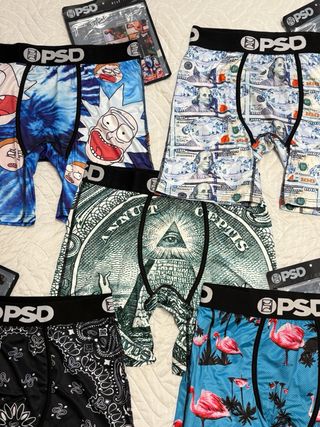 Pack de cinco calzoncillos tipo bóxer de la marca PSD. Diseños variados y divertidos. - Calzoncillos tipo bóxer. - Diseños: Rick y Morty, billetes de dólar, Ojo de la Providencia, bandana y flamencos. - Talla M.