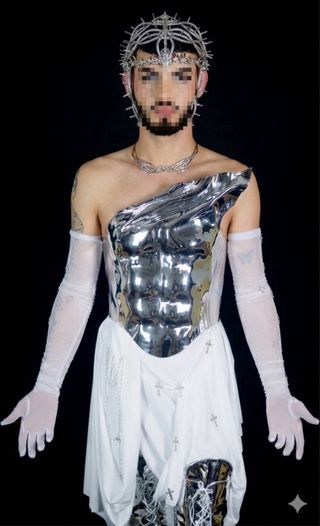 Este disfraz es perfecto para carnaval o cualquier fiesta temática. - Diseño llamativo en plateado y blanco. - Talla única adaptable. -corona de espinas metalizada realizada a mano. -corset metalizado confeccionado en emiratos arabes. -bota extra alta n:44