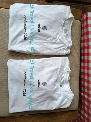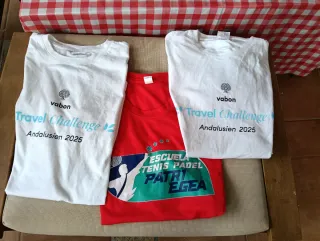 Se venden tres camisetas de manga corta de la marca Vabon. Dos son blancas con el logo Travel Challenge Andalusien 2025 y una es roja con un diseño de Escuela Tenis Padel Patri Egea. - Camiseta blanca con diseño Travel Challenge Andalusien 2025. - Camiseta blanca con diseño Travel Challenge Andalusien 2025. - Camiseta roja con diseño Escuela Tenis Padel Patri Egea.