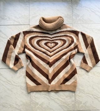 Abrigo de punto con un diseño llamativo de corazón en el pecho y cuello alto. - Tejido suave y cálido. - Mangas largas. - Estampado de rayas en tonos marrones y beige.