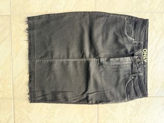 Falda vaquera de la marca ONLY en color negro. Presenta un diseño moderno con el bajo deshilachado. - Cintura con trabillas para cinturón. - Cierre de botón y cremallera. - Bolsillos delanteros y traseros.
