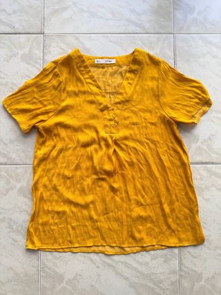 Blusa de manga corta con cuello en V y detalle de botones. - Tejido ligero y con textura. - Diseño con pinzas en la parte delantera.