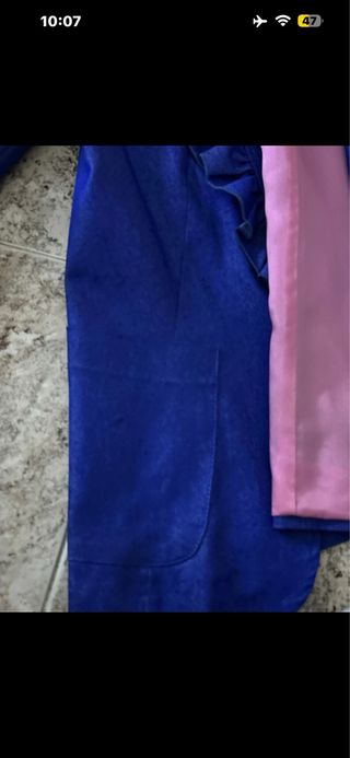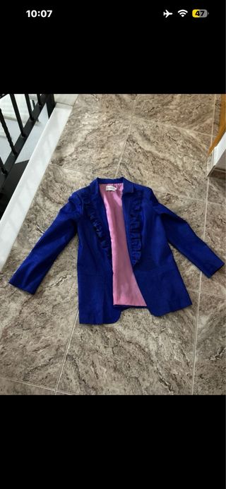 Elegante chaqueta para mujer con un diseño moderno y detalles de volantes. - Color azul vibrante. - Forro interior en tono rosa. - Cuello solapa clásico. - Cierre frontal abierto.
