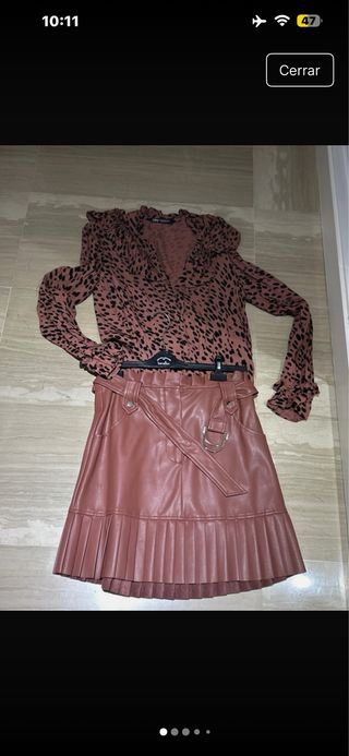 Conjunto de falda y blusa de Zara. - Blusa con estampado de leopardo y volantes. - Falda de efecto piel con cinturón y plisados.