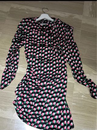Vestido largo con estampado de pata de gallo en tonos verdes y blancos. Presenta un diseño cruzado con cinturón y mangas largas abullonadas. - Diseño cruzado. - Mangas largas abullonadas. - Cinturón para ajustar. - Largo hasta el tobillo. Talla M, tengo otro idéntico de la talla S en mi perfil