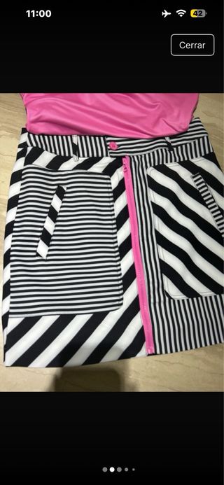 Conjunto de dos piezas Lolina con un diseño llamativo. - Camiseta rosa con bolsillo de corazón a rayas. - Falda con estampado de rayas en blanco y negro.