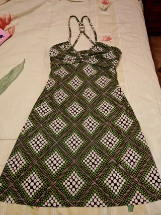 Vestido corto con un llamativo estampado geométrico y de puntos. Ideal para días cálidos. - Diseño con tirantes cruzados en la espalda. - Cintura elástica para un mejor ajuste. - Largo hasta la rodilla.