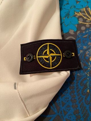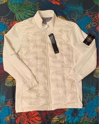Chaqueta Stone Island de color blanco. Presenta un diseño acolchado en la parte frontal y mangas de tejido. - Cierre de cremallera. - Cuello alto. - Parche de la marca en la manga.