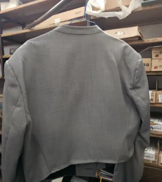 Vendo Chaqueta de corto gris, talla 58. REGALO, pantalón negro talla 50, con botones, como si fueran caireles, es un pantalón de talle bajo, 47cms cintura 94cms largo. Vendo por no usar.